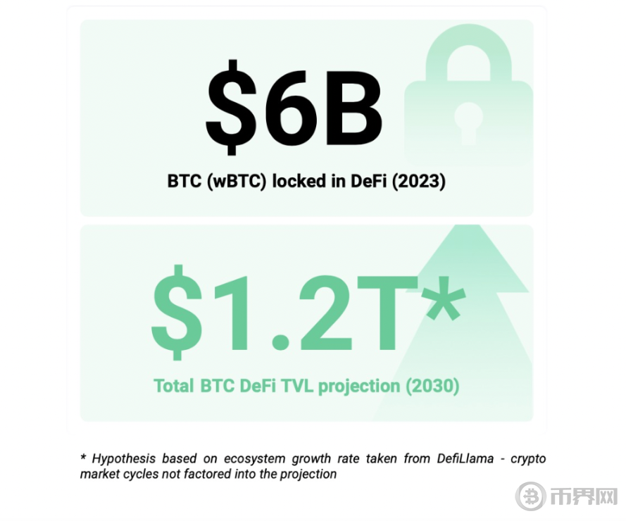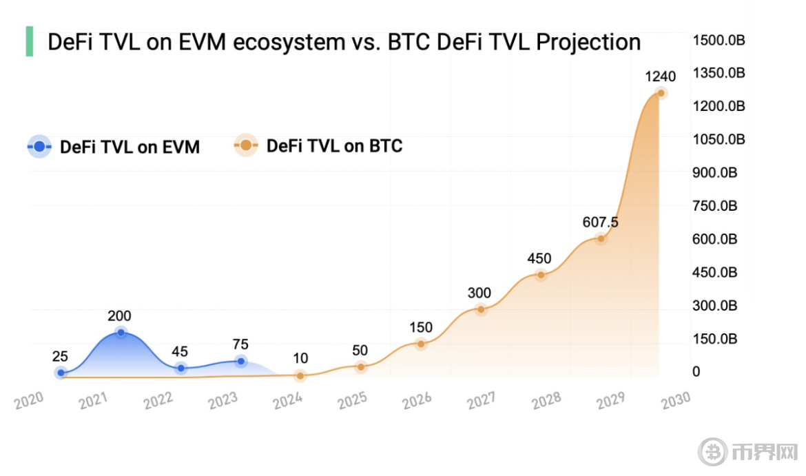 • BTCFi(比特币金融)就像一个移动的比特币银行,是围绕比特币展开的一系列金融活动,包括比特币借贷、质押、交易、期货和衍生品等。根据 CryptoCompare 和 CoinGecko 的数据, 2023 年 BTCFi 市场的规模已经达到了约 100 亿美元。根据 Defilama 的数据预测到 2030 年 BTCFI 的市场会达到 1.2 万亿美金的规模,这一数据包括了比特币在去中心化金融(DeFi)生态系统中的总锁仓量(TVL),以及比特币相关的金融产品和服务的市场规模过去十年,BTCFi 市场更是逐渐显示出了显著的增长潜力,吸引了越来越多的机构参与,例如灰度(Grayscale)、贝莱德(BlackRock)和摩根大通(JPMorgan)开始涉足比特币和 BTCFi 市场。机构投资者的参与不仅带来了大量的资金流入,增加了市场流动性和稳定性,也提升了市场的成熟度和规范性,为 BTCFi 市场带来了更高的认可度和信任度。