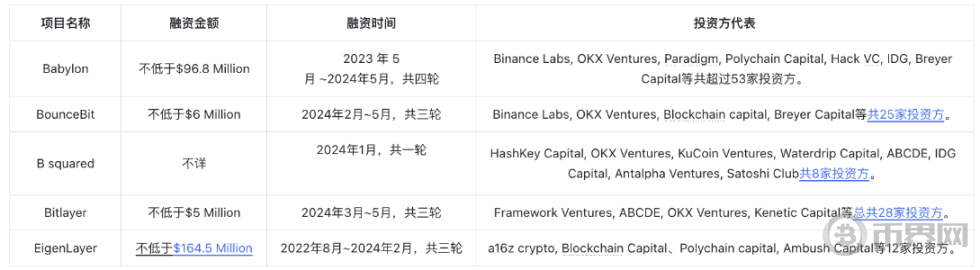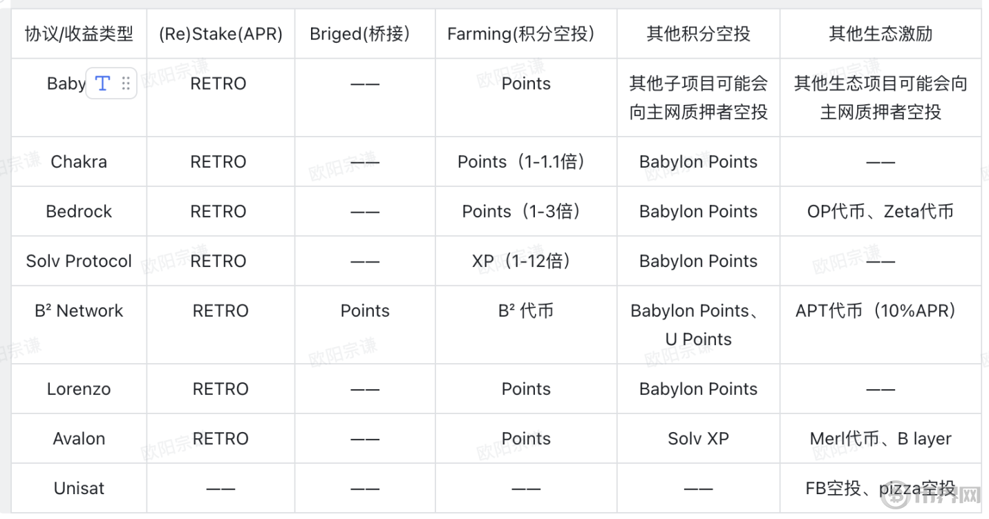注:表格中的 RETRO 指因为 Babylon 的 APR 还没有被统计,而其他项目的 APR 又取决于 Babylon,这里不进行估计。除此之外,币安、OKX、HTX 等均与 Babylon、Chakra、Bedrock、B² 、Solv Protocol 等合作开展了一系列预质押、farming 等活动,用户已经取得了很高的收益,特别是币安 web3 钱包的一系列质押活动。