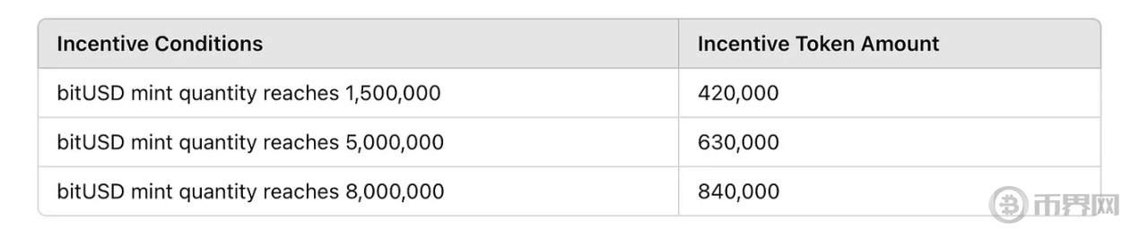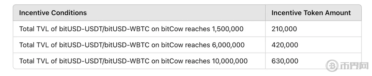 ○ 奖励方式:bitUSD 铸造达到目标以及在 bitCow 上为 bitUSD 池子增加流动性,两种方式激励详情如下图。流动性激励金将根据用户在 Merlin 链上获得的 bitPoints 进行分配,用户获得的积分越多,获得的代币激励就越多。
