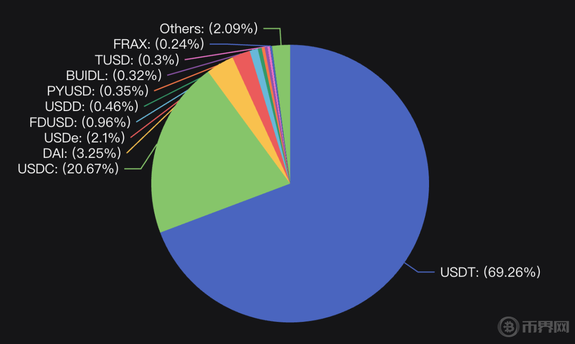 2024 年 7 月 14 日的稳定币市值前十占比,图源 DefiLlama