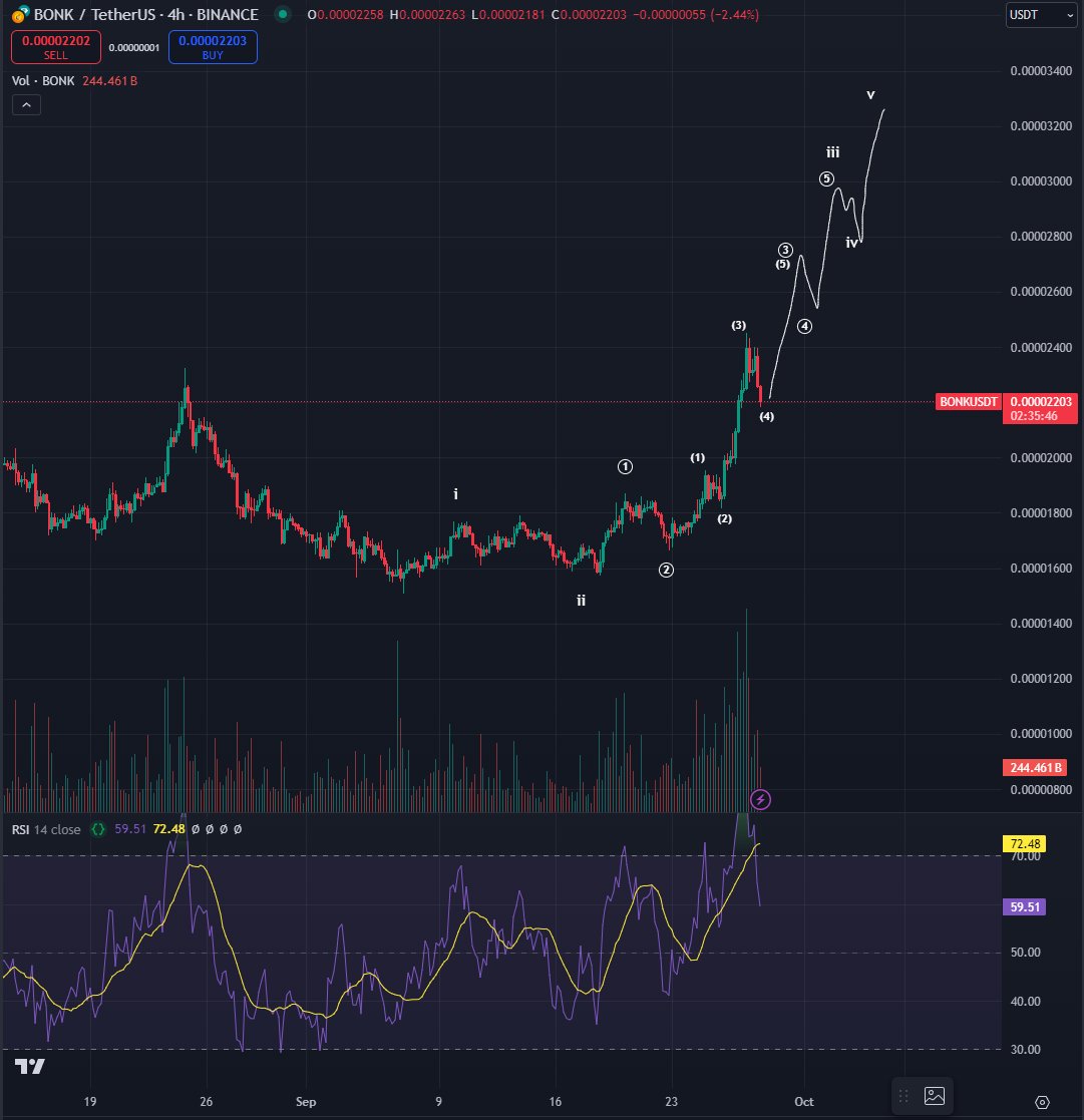 Based on the trader’s chart, he appears to predict that BONK will move above $0.00032 before ending its five-wave surge on the four-hour chart.