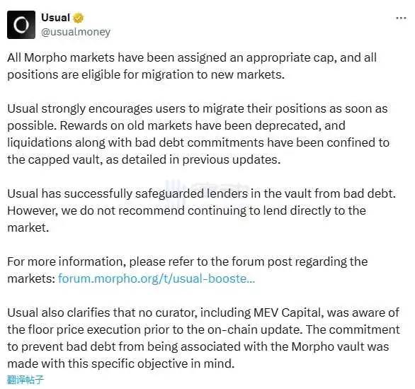 Usual 表示已成功保护了保管库中放贷人免受坏账影响,但不建议继续直接向该市场放贷。此外,Usual 澄清包括 MEV Capital 在内的任何托管人在链上更新前均不知情底价执行情况。