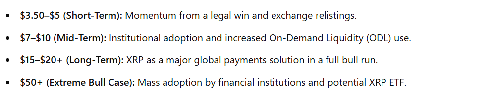 XRP的按照案件的胜利,XRP的目标范围可能为$ 3- $ 5。该平台预测中期的增长至10美元,这可能会因其机构使用的增加而引起。如果代币将最高点作为全球付款解决方案,则可能会达到15至20美元。如果大规模收养爆炸爆炸,金融机构包含XRP ETF,则代币甚至可以针对50美元。