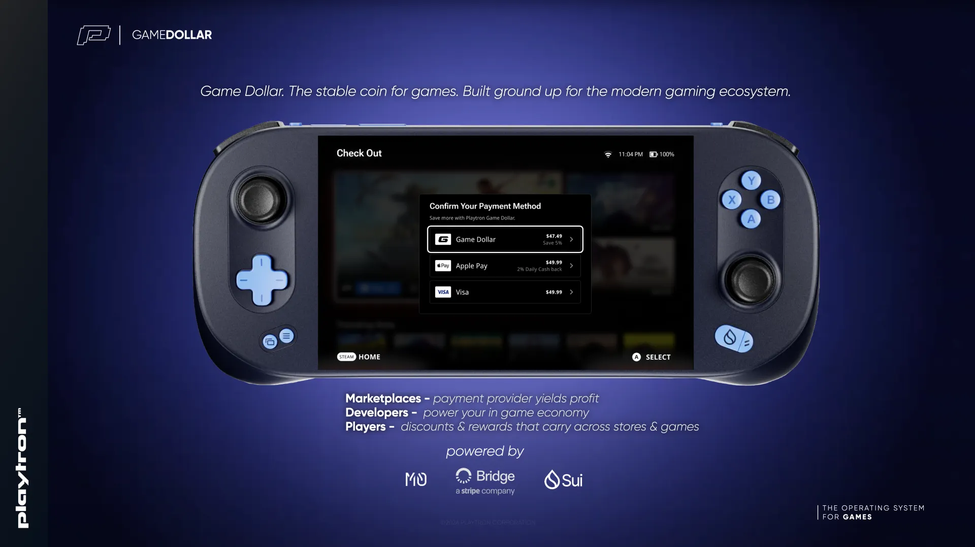 游戏美元将在今年的第四季度推出,将用于在Playtron Gameos生态系统上购买,订阅和奖励,包括即将推出的Suiplay0x1 Handheld Console。 Playtron声称该稳定币将得到短期美国国债的支持定义经过M0,令牌背后的平台。