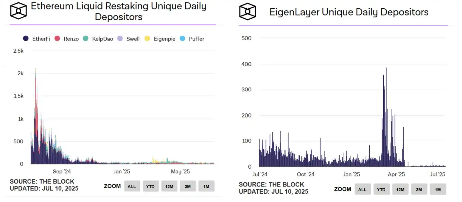 用户活跃度的下滑更加显著。根据 The Block 数据,以太坊流动性再质押的日活跃存款用户数已从 2024 年 7 月的高峰(上千人)骤降至当前仅三十余人,而 EigenLayer 的每日独立存款地址数量甚至跌至个位数。