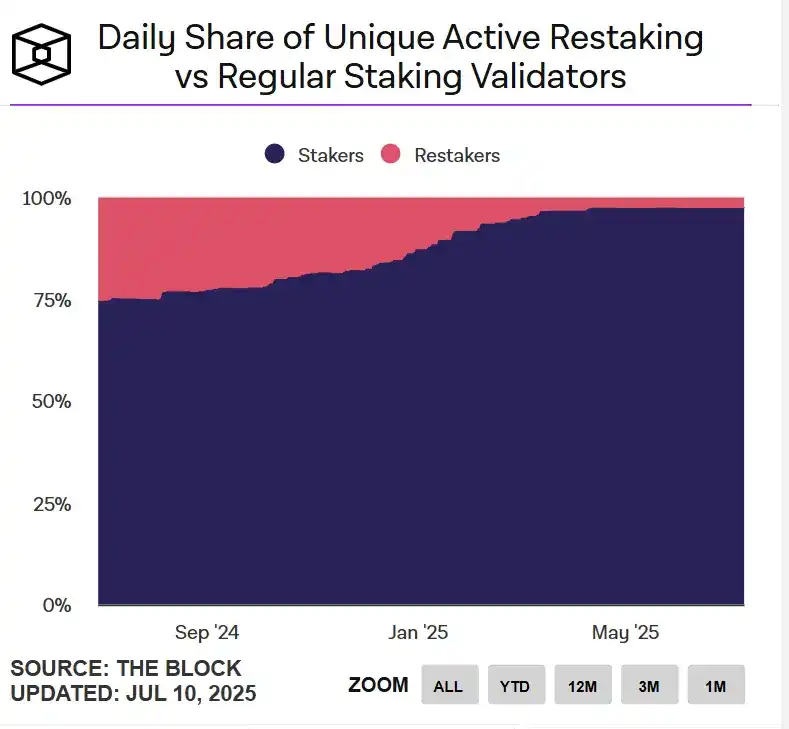 从验证者角度看,再质押的吸引力也在减弱。当前以太坊每日活跃的再质押验证者,与常规质押验证者相比已不足 3%。