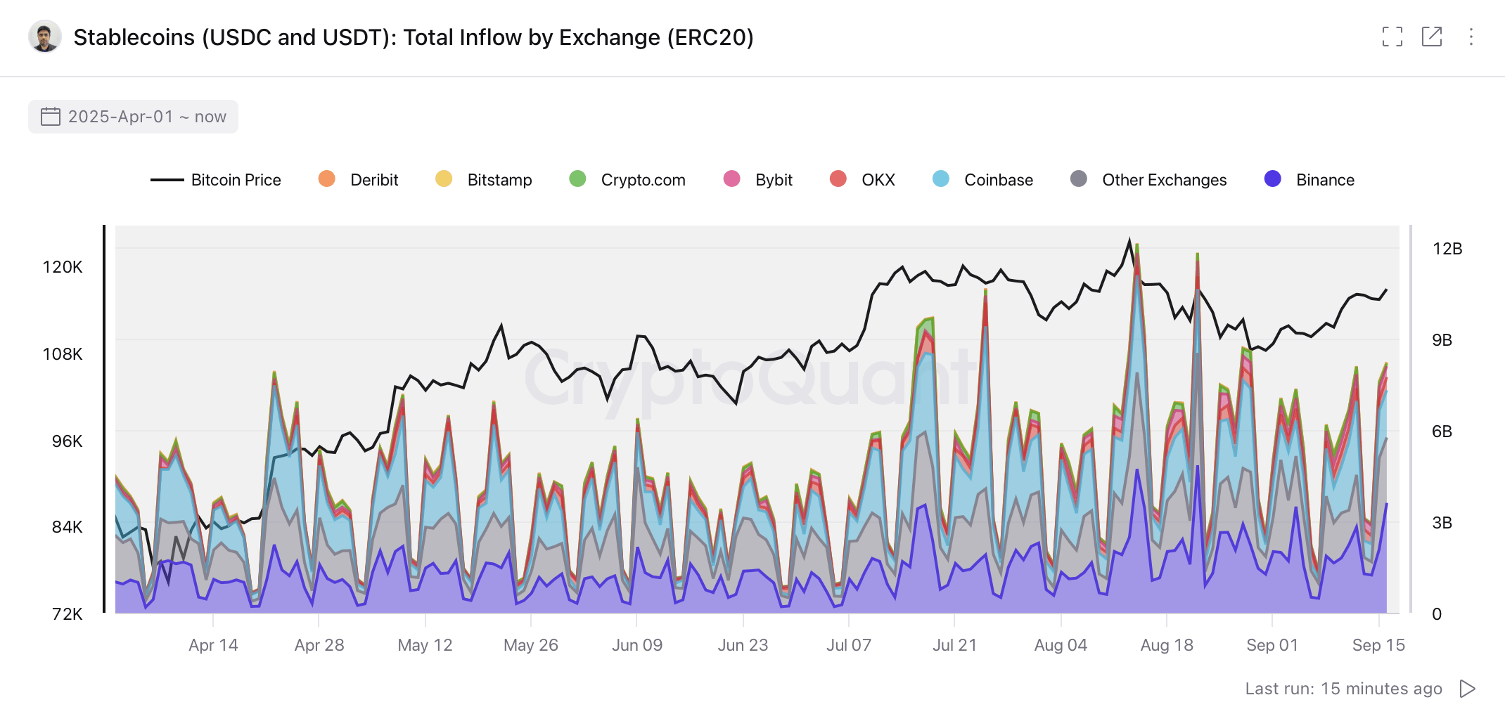 平均值USDT自 7 月以来,存款几乎翻了一番,从 2025 年的低点 6.3 万美元攀升至如今的约 13 万美元。鲸鱼级转账在币安、Bitstamp 和 Deribit 上最为常见,平均交易规模分别接近 21.4 万美元、18.1 万美元和 16.6 万美元。