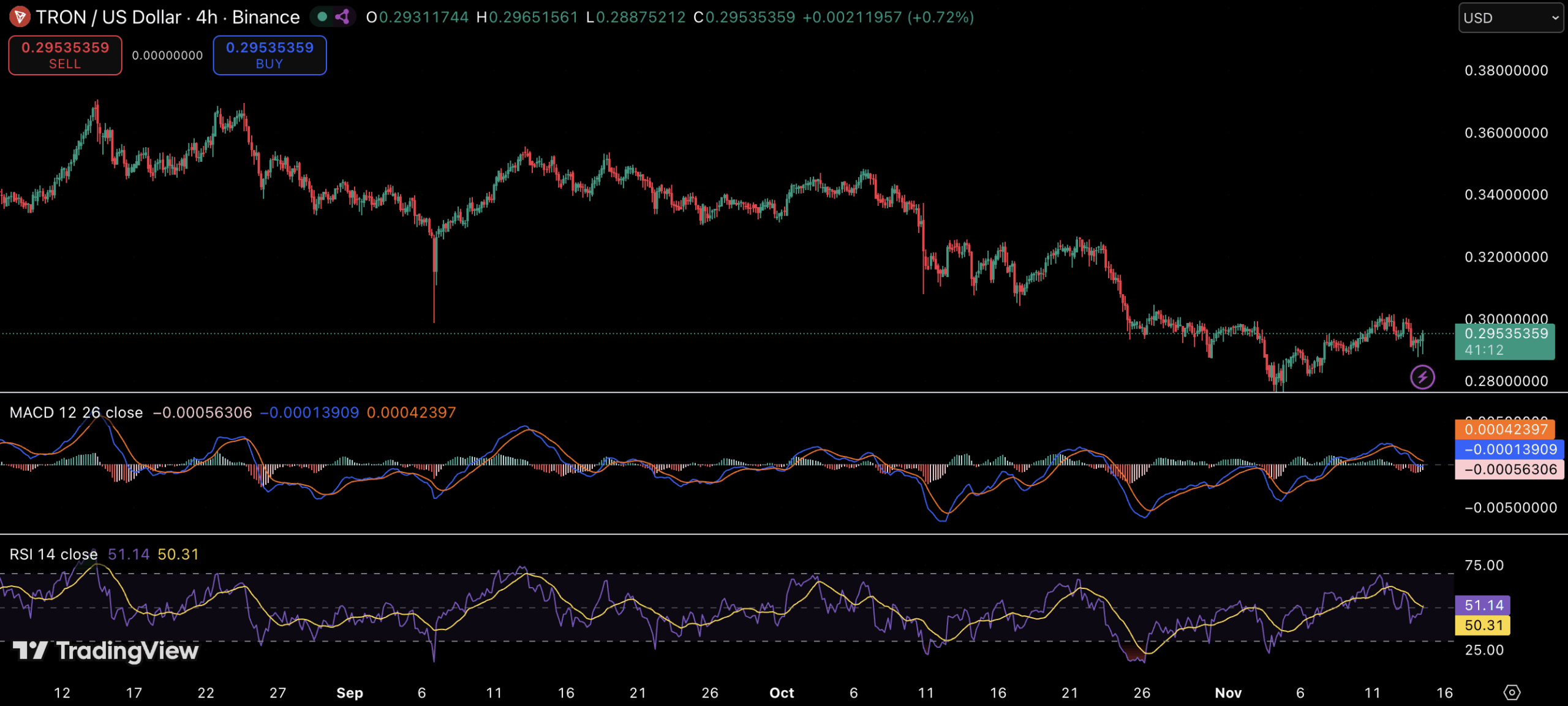 - 尽管技术信号看跌,TRX 仍保持在 0.29 美元上方。