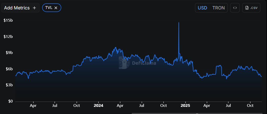 DefiLlama数据显示,Tron的总锁定价值(TVL)周二跌至45.8亿美元,并且自10月初以来持续下降。TVL下降表明Tron生态系统的活跃度减弱,用户参与度下降,这意味着参与充值或使用基于TRX协议的用户数量减少,这对Tron的价格不利。