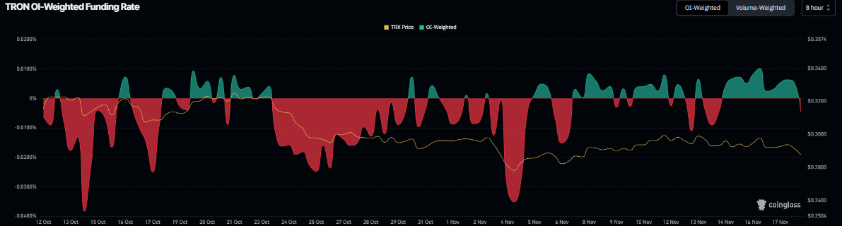 该指标已转为负值,周二达到 -0.0044%,表明空头正在向多头支付报酬,暗示市场对 TRX 持悲观态度。