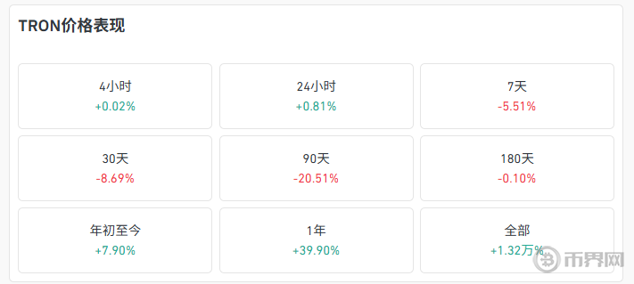 根据最新数据,TRX在过去7天内上涨了2.06%,但在过去30天内下跌了8.66%,尽管如此,从一年跨度看,TRX仍实现了57.33%的涨幅,显示出其长期投资价值。