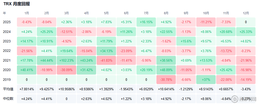 2024年,TRX联动市场走牛,在2024年创下历史最高价格¥3.06(约$0.4407)。