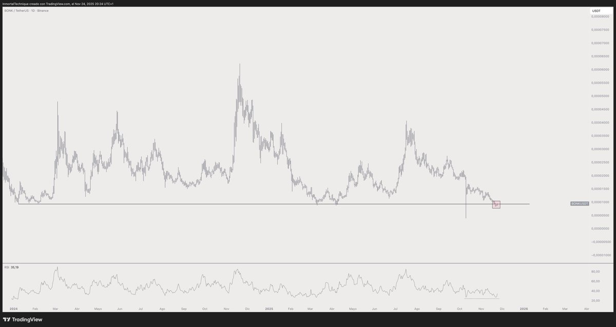 The trader also says that the meme token Bonk (BONK) may be forming a local bottom at a key level around $0.00000900, indicating a potential bullish reversal.