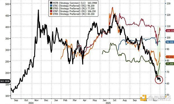 MicroStrategy的最新动向及其引发的策略转变担忧,迅速在市场引发负面反应。周一,其股价盘中最低触及156美元,尽管收盘时有所回升,但仍较7月中旬的52周高点下跌了64%。今年以来,该股已累计下跌近41%。与此同时,比特币价格也未能幸免,下跌超4%至约86370美元。