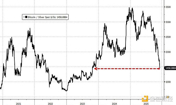 比特币购买力缩水:在一年前,一枚比特币可以购买3500盎司白银;而如今,同一单位的比特币仅能购买1450盎司白银,创下自2023年10月以来的最低点。这一比率的大跌直观地反映了加密资产相对于传统避险资产(如白银)的疲软。