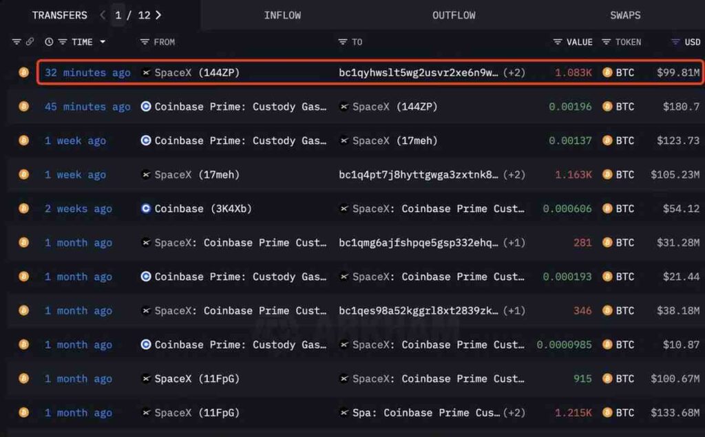 SpaceX转出略多于 1,083比特币(比特币根据 Finbold 标记的链上数据显示,12 月 5 日上午,一笔价值约 9980 万美元的交易达成。
