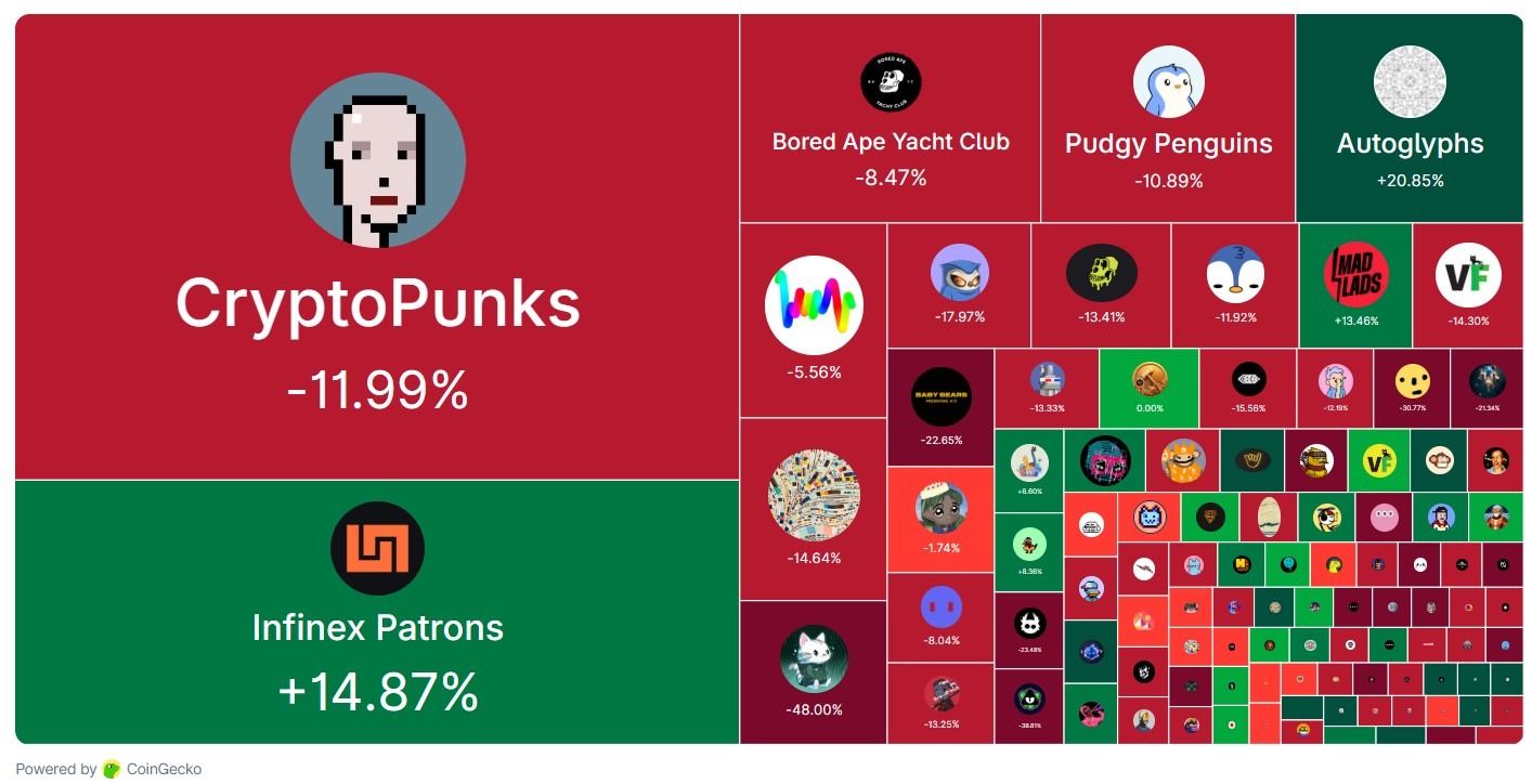 CoinGecko数据显示,大多数顶级NFT系列反映了市场的整体下滑,其中市值最大的CryptoPunks在过去30天内下跌了12%。