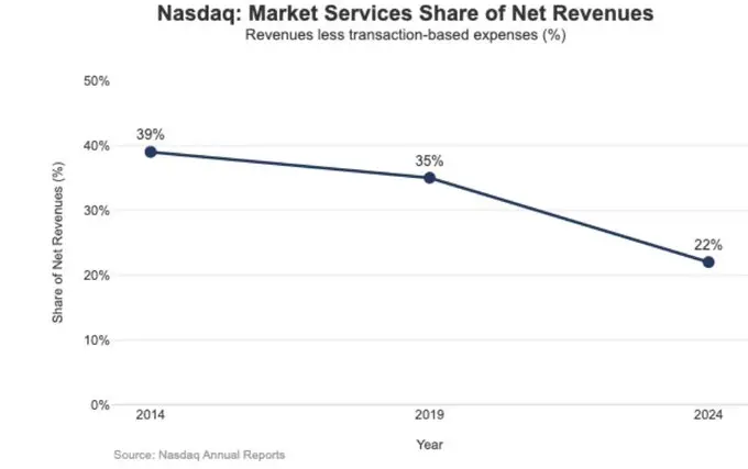 在 2024 年,纳斯达克的 Market Services(市场服务)收入为 10.20 亿美元,占总收入 46.49 亿美元的 22%;而这一比例在 2014 年曾高达 39.4%,在 2019 年也仍有 35%。
