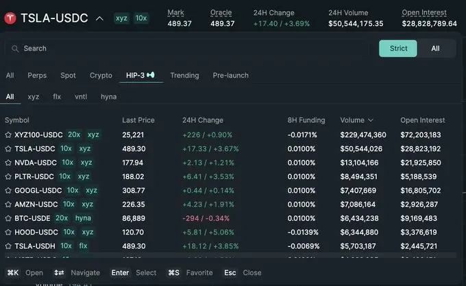 与此同时,HIP-3 市场最初被定位为主要通过 Builder 分销、而不在主前端展示;但现在,这些市场已经开始在 Hyperliquid 的原生前端中、以严格上币标准进行展示。