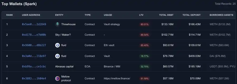 我分析了 Aave 与 SparkLend 上排名前 50 的钱包地址,并对主要借款方进行了标注。