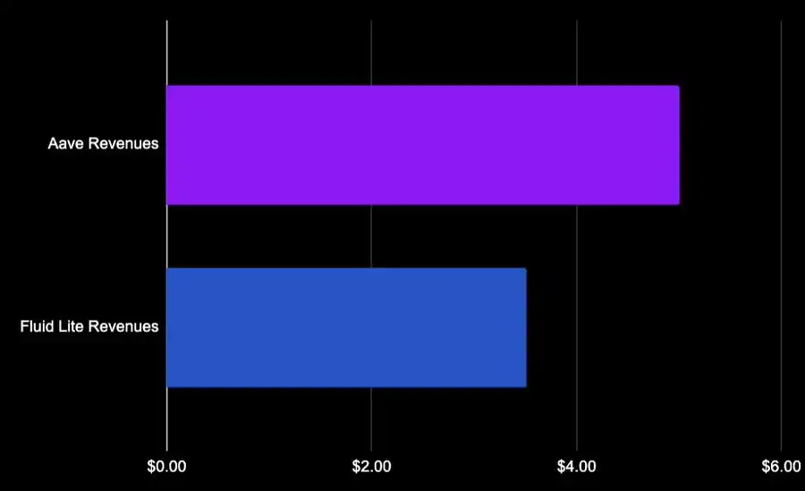 Fluid Lite ETH:20% 绩效费 + 0.05% 退出费,不收平台管理费。从 Aave 借入 17 亿美元 wETH,支付约 3300 万美元利息,其中约 500 万美元归 Aave,Fluid 自身收入接近 400 万美元。