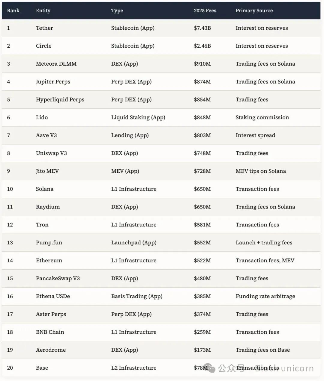 表 1:2025 年区块链收入排名——反转变得可量化(来源:DefiLlama,2025 年 12 月)