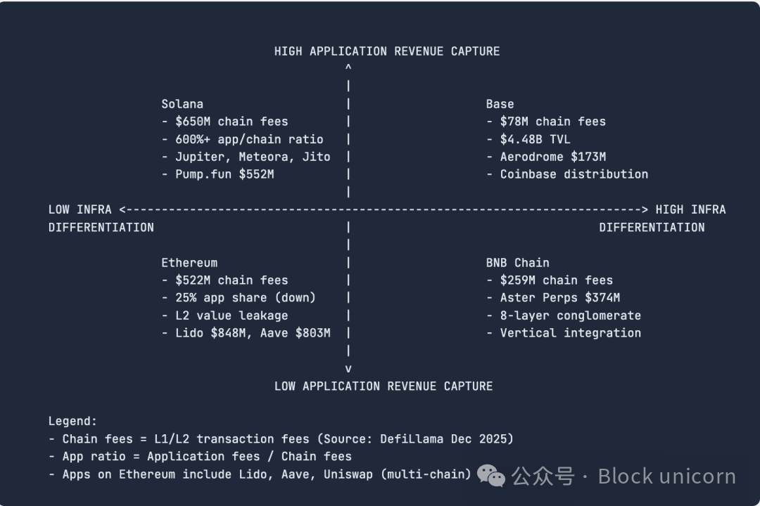 2025 年四大主流区块链生态系统采取了截然不同的战略,揭示了基础设施到应用价值的转变如何在不同的架构和治理选择中体现。以太坊追求务实的基础设施优化,却牺牲了部分应用市场份额。Solana 瞄准机构资本市场,同时努力摆脱与“模因币”的关联。Base 利用 Coinbase 的监管护城河和分销优势。BNB 链则在八个垂直层面上执行了腾讯集团的模式。每种策略都揭示了将影响 2026 年竞争格局的结构性张力。