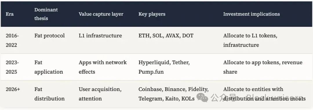 2025 年的实证数据需要对现有理论进行修正。“胖协议”理论假设共享状态和原生代币能够创造正和博弈的动态,协议的成功惠及所有参与者。然而,实际情况却呈现出一种竞争性的动态:具有网络效应的应用能够从商品化的基础设施中获取价值,类似于谷歌和 Facebook 如何从商品化的 TCP/IP 协议栈中获取价值。2026 年的问题在于,是否会出现第三阶段:即“胖分配”阶段,在这个阶段,对用户获取、注意力和入门的控制将成为主要的价值获取方式。