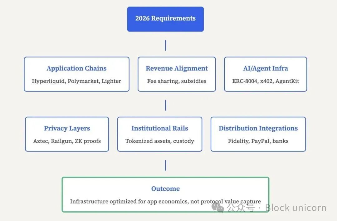 价值重心从基础设施向应用转移,催生了对新一代专用基础设施的需求,这种基础设施将针对应用经济效益而非通用计算进行优化。2016 - 2024 年的基础设施设计基于“协议至上”的假设:最大程度地去中心化,提供通用计算,并通过原生代币升值获取价值。而 2026 年及以后的基础设施设计将基于“应用至上”的假设:最大程度地降低应用成本,为特定用例提供专用计算,并通过灵活的费用结构和收益分成机制实现应用层面的价值获取。