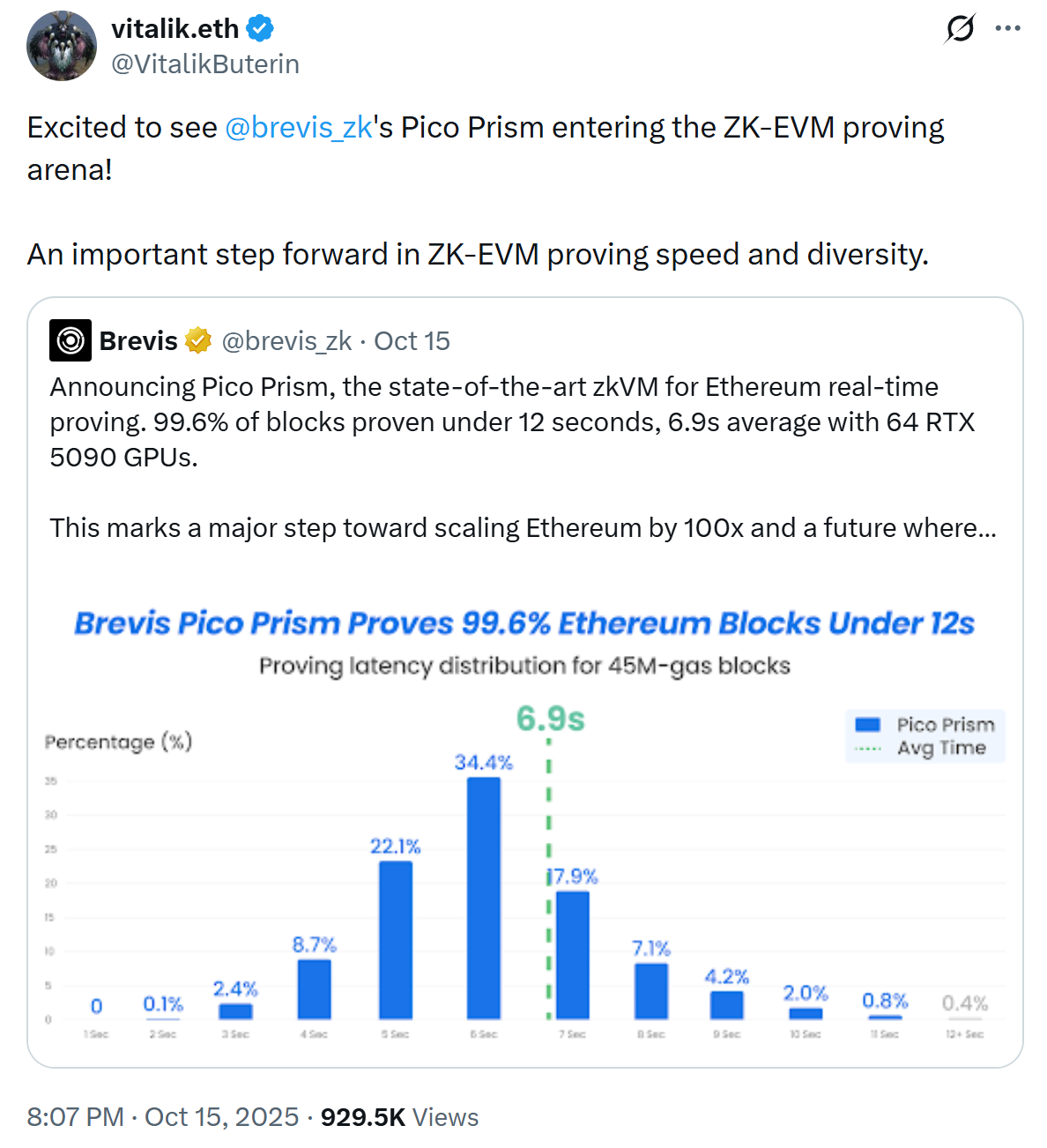 2025 年 10 月,Brevis 宣布推出的 zkVM Pico Prism 在消费级硬件上实现以太坊实时证明,并在 Vitalik Buterin、以太坊官推以及以太坊 OG 研究员等以太坊核心圈层的转发支持下,正式站上未来以太坊扩容的核心舞台。