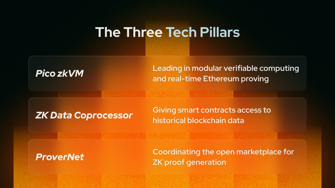 这三大产品组件层层嵌套:ZK Data Coprocessor 负责「拿数据」,Pico zkVM 解决「证明安全高效生成」问题,而 ProverNet 则通过市场决定谁来证明以及如何证明最优,形成了一个完整的「无限可验证计算」闭环。