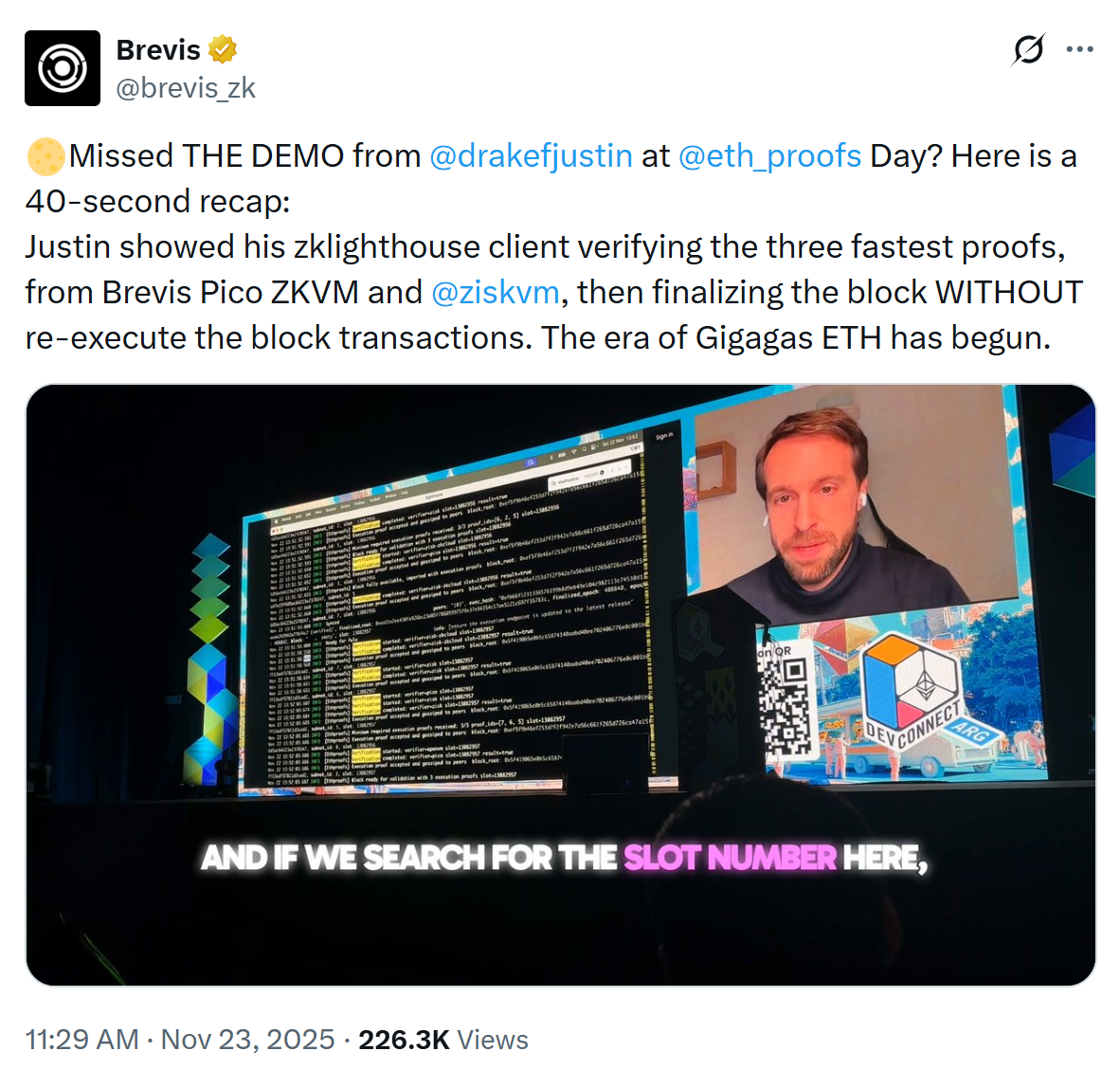 2025 年 11 月的 ETH Devconnect 大会上,以太坊 OG 研究员 Justin Drake 现场通过 Demo 进行了 Brevis 的 Pico ZKVM 完成新共识算法的演示,随后不久 Vitalik 也发表推文分享了围绕这一方向以太坊未来可能会推进的改进。Brevis Pico ZKVM 的突破性进展使得以太坊 L1 zkEVM 扩容路线从规划真正变成可以实现的未来。