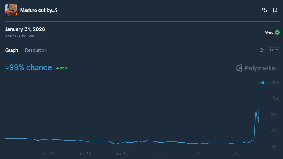 在这场行动开始前数小时,Polymarket 上三个毫无历史记录的新钱包突然开始在概率极低的盘口「马杜罗于 2026 年 1 月 31 日前失权」疯狂押注「是」。