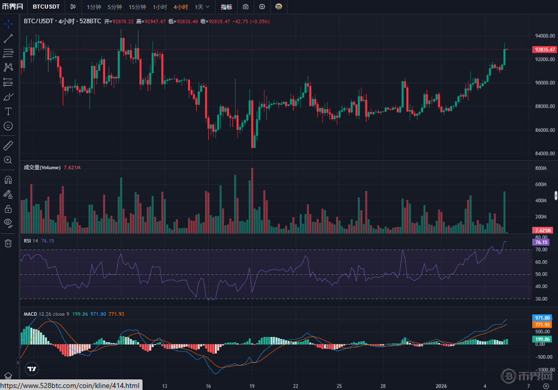 价格与成交量:当前价格 92933.47(4 小时跌 1.05%),属于前期冲高后的回落调整;4 小时成交量 7.621M,未出现大规模放量,说明抛压是阶段性获利回吐,而非恐慌性撤离。