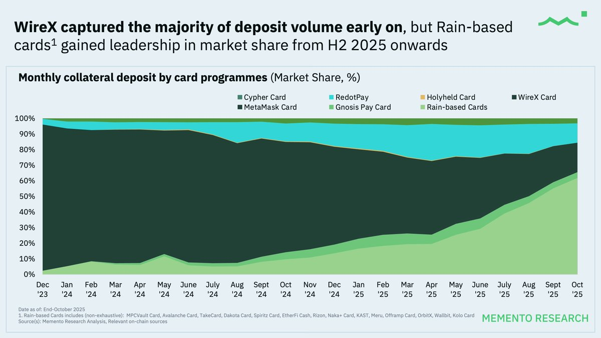 wirexapp 在 2024 年的大部分时间里占据了存款量的主要份额,但自 2025 年下半年起,Rain 系列加密卡在市场份额上取得了领先地位。