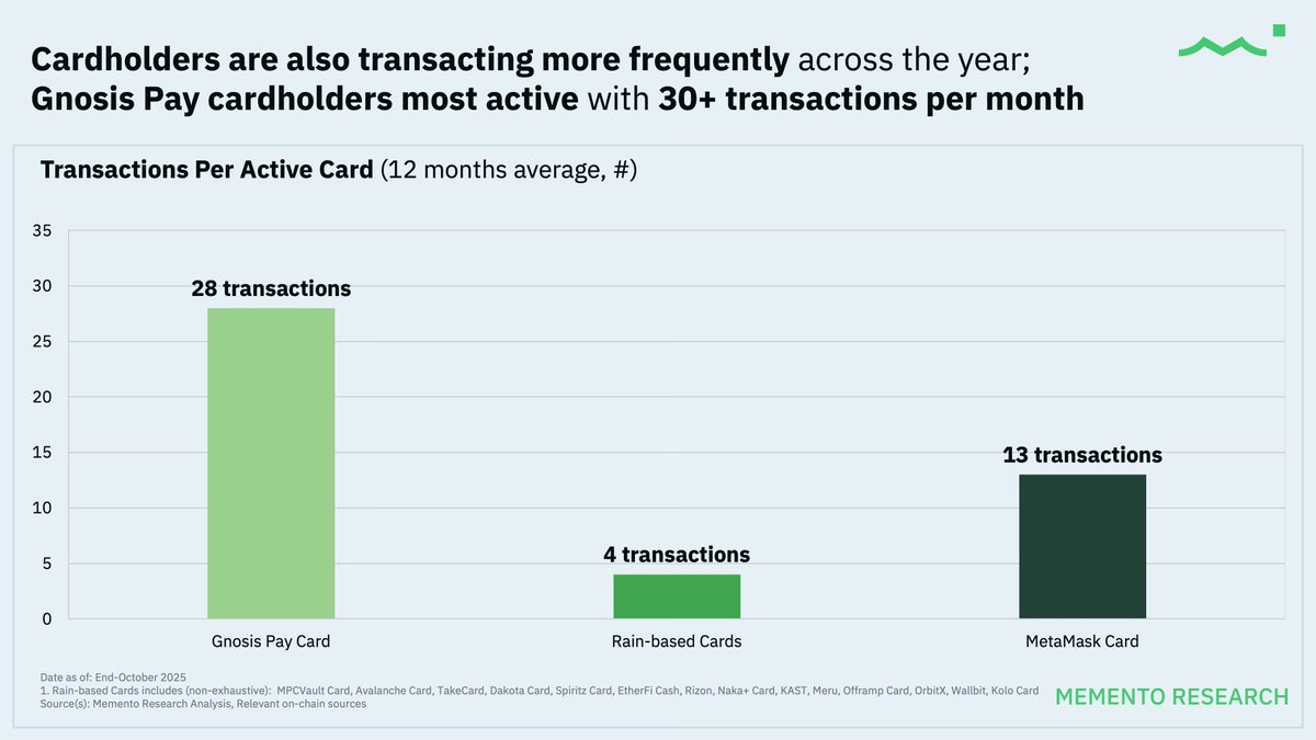 值得注意的是,gnosispay 的持卡人在月度消费金额上更高,这表明其用户更倾向于将其作为主要支付卡片进行更一致的使用。