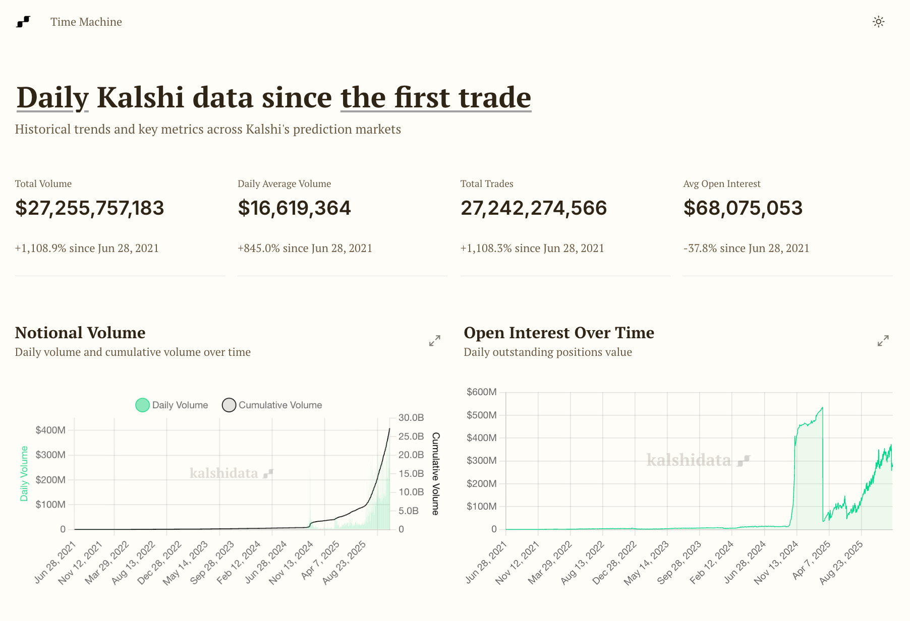 据 KalshiData 网站数据,自 2021 年 6 月 28 日上线以来,Kalshi 历史总交易额达 27,255,757,183 美元,日均交易量达 16,619,364 美元,总交易笔数达 27,242,274,566 次。