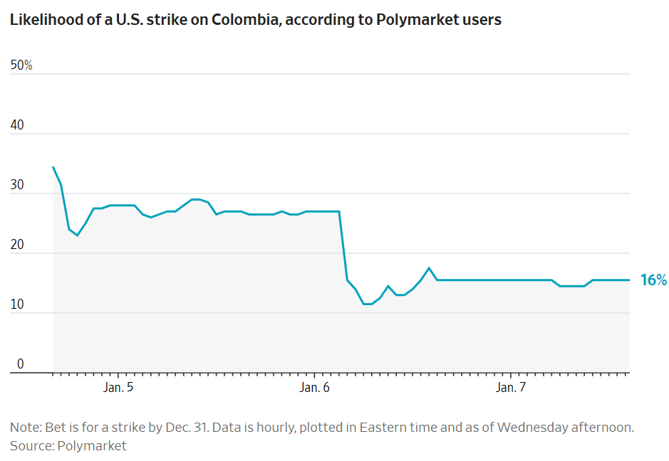 根据Polymarket用户的数据,美国对哥伦比亚发动袭击的可能性