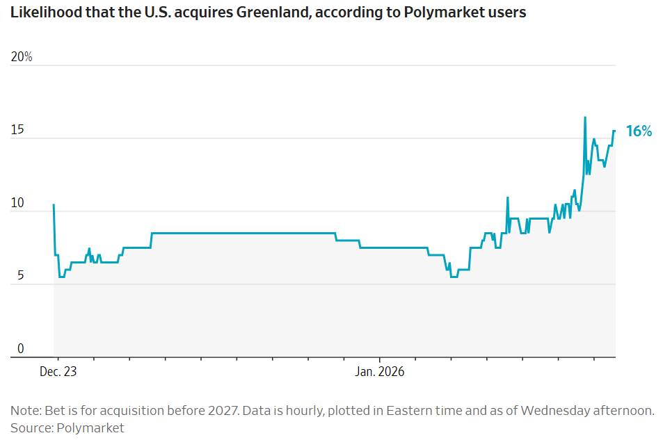 交易员们认为,到6月30日前,哈梅内伊不再担任伊朗最高领袖的可能性为36%,高于美国在委内瑞拉采取军事行动前不到20%的水平。至于特朗普在年底前获得格陵兰岛的可能性,概率虽低,但正在上升。
