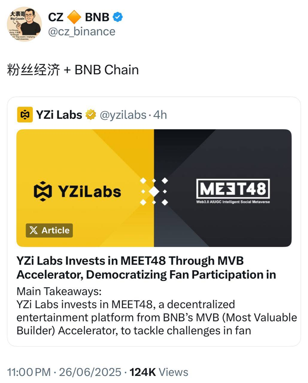 2025 年 6 月,YZi Labs 投资于 MEET48。受此消息影响,$IDOL 当日涨幅超 30%。与此同时, MEET48 还入围 BNB Chain MVB,是币安生态重点扶持的娱乐项目。