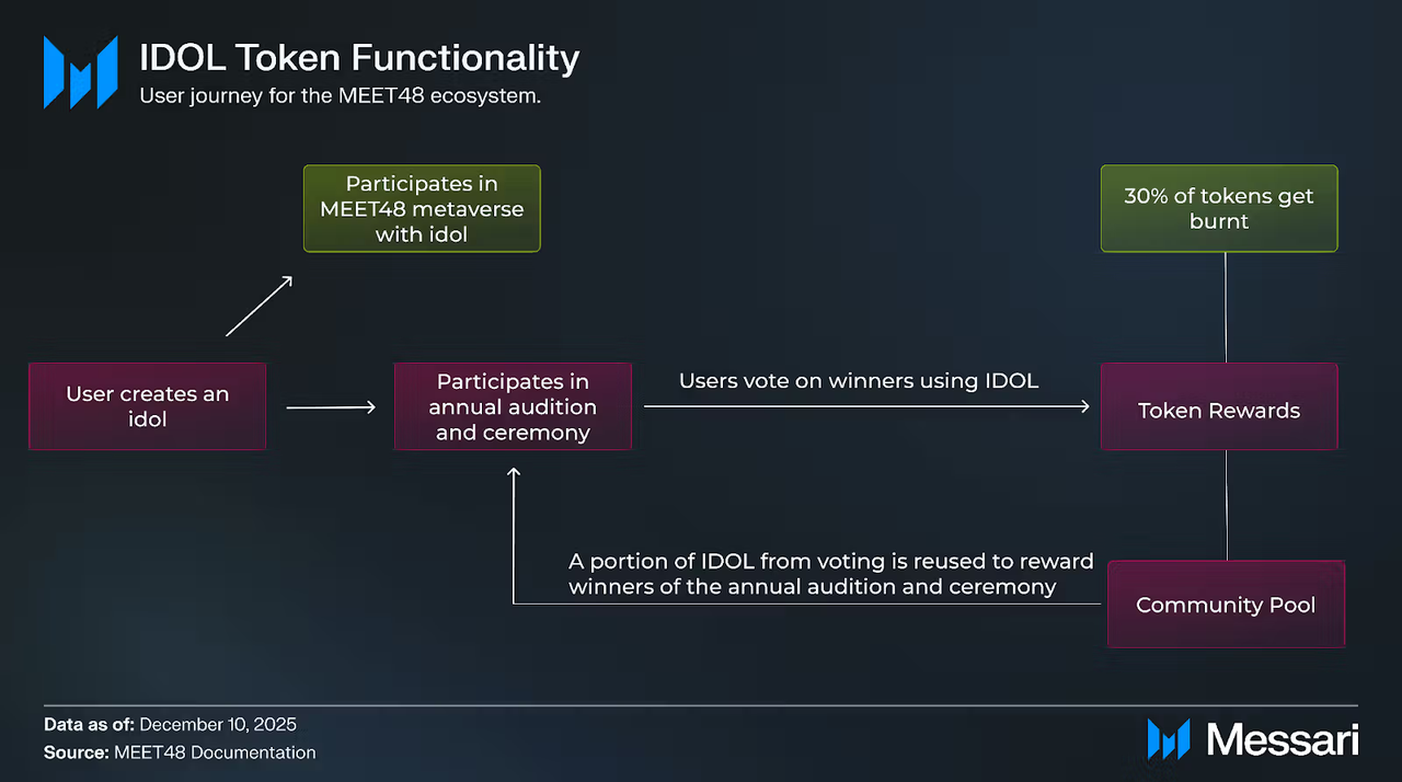 这些效用并非孤立,而是形成「创作-互动-治理-收益」的闭环。$IDOL 的多面性,进一步推动 MEET48 从单纯的虚拟偶像平台,演变为融合 AI、区块链与娱乐的元宇宙枢纽。