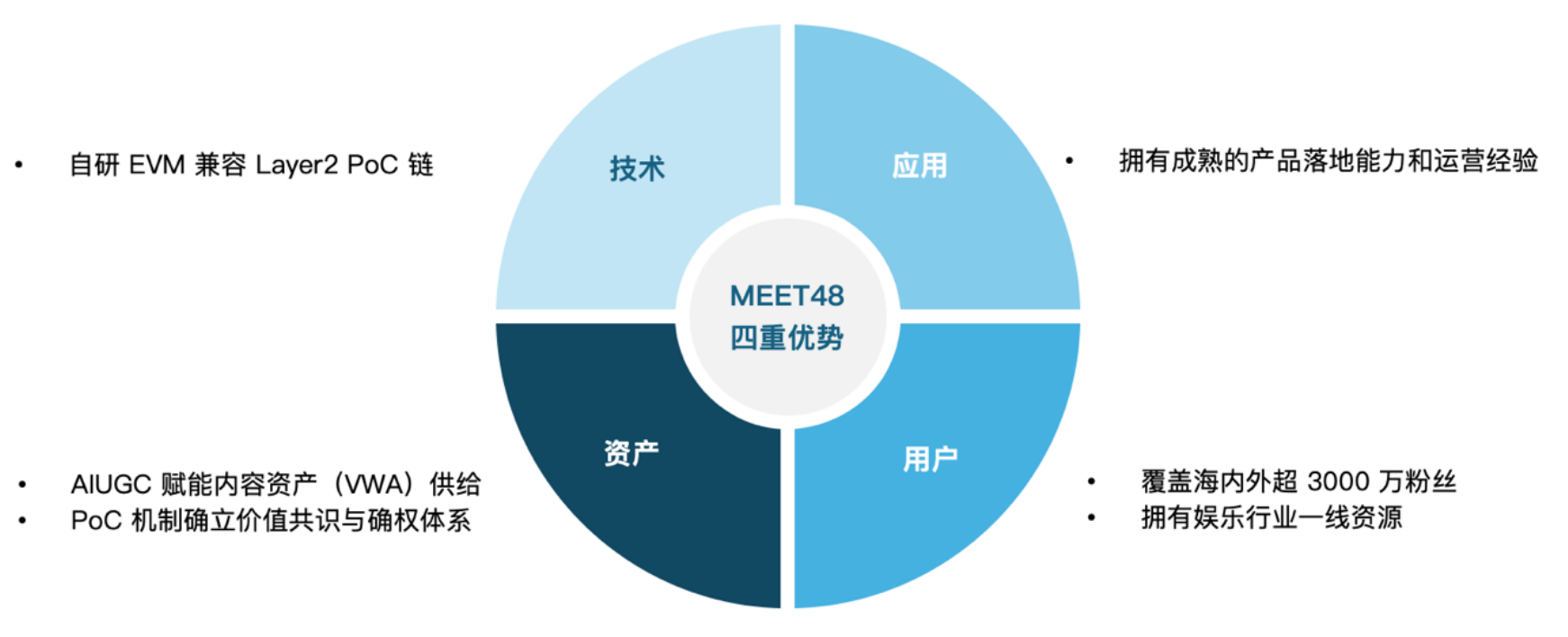 作为全球首个一站式去中心化虚拟偶像养成和粉丝经济娱乐生态,MEET48 致力于以 UGC 模式为基础起点,利用 AI 技术,Web3 共识和区块链技术在内容保护和创作者激励方面的天然优势,在 UGC 创作者社区的发展方面发挥 Web2 平台所无法达到的价值成长和用户凝聚作用。