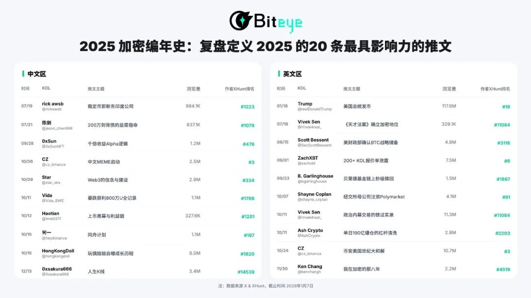 2025 年,影响力不再只属于价格喊单和情绪输出,真正被反复传播的,是真实经历、链上证据、制度冲突、价值观对撞,以及政治与金融的正面交锋。