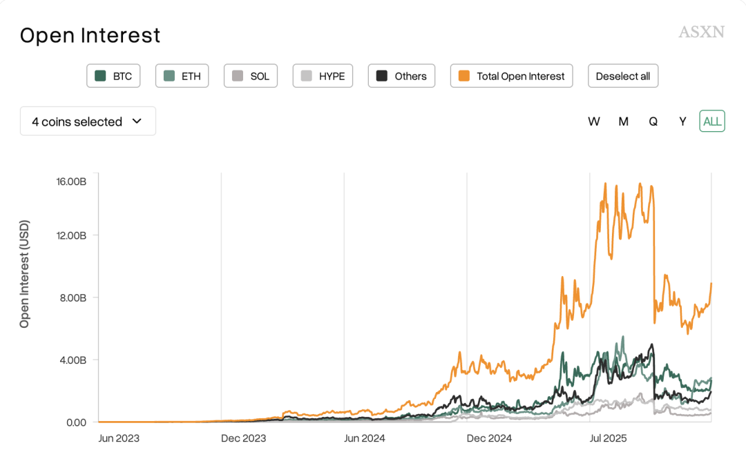 注意一下,这和 Perp DEX 卷不死 Hyperliquid 并不冲突,币圈的资产只有 BTC/ETH,现阶段整体 Perp 市场规模已经阶段性触顶。