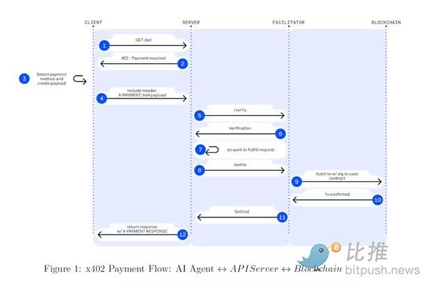 智能体向服务器发送请求以获取某种产品或服务(例如流媒体订阅或电子书),服务器则返回一个「需要付款」的请求(HTTP 402)。该请求包含诸如所需金额、接受的代币类型、发送付款的钱包地址以及支付所在的区块链等字段。
