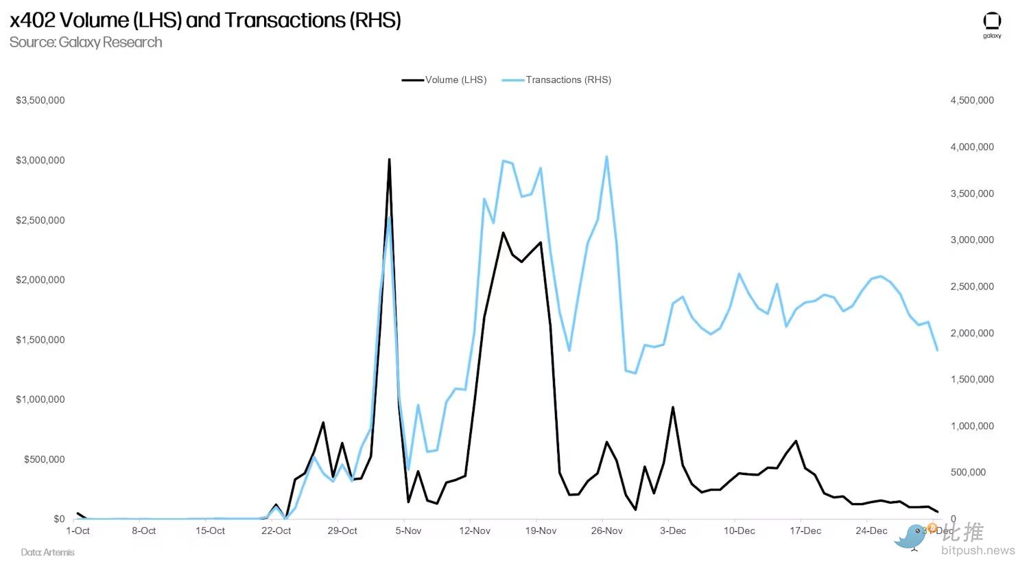 正如我们曾经提到的,x402 活动在 10 月下旬和 11 月初经历了最初的激增,此后活动逐渐减少。