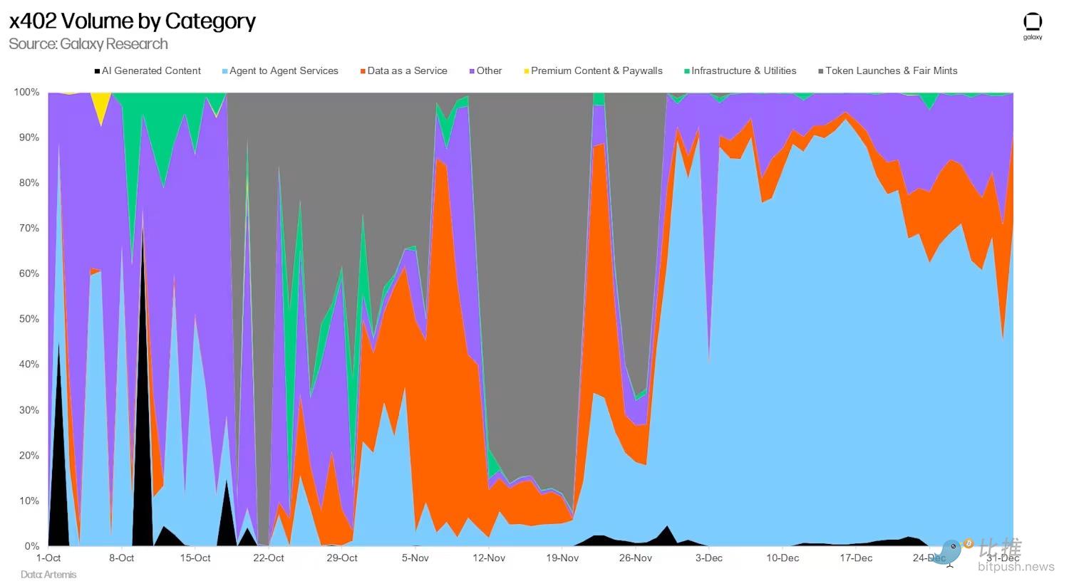 与加密领域引入原语时常见的情况一样,最初的采用和兴趣主要由投机活动驱动,10 月底的峰值是由团队使用 x402 铸造和购买 Memecoin 引起的。然而自那时起,智能体对智能体服务、数据即服务以及基础设施和实用程序的交易量和交易笔数开始占据越来越大的市场份额。
