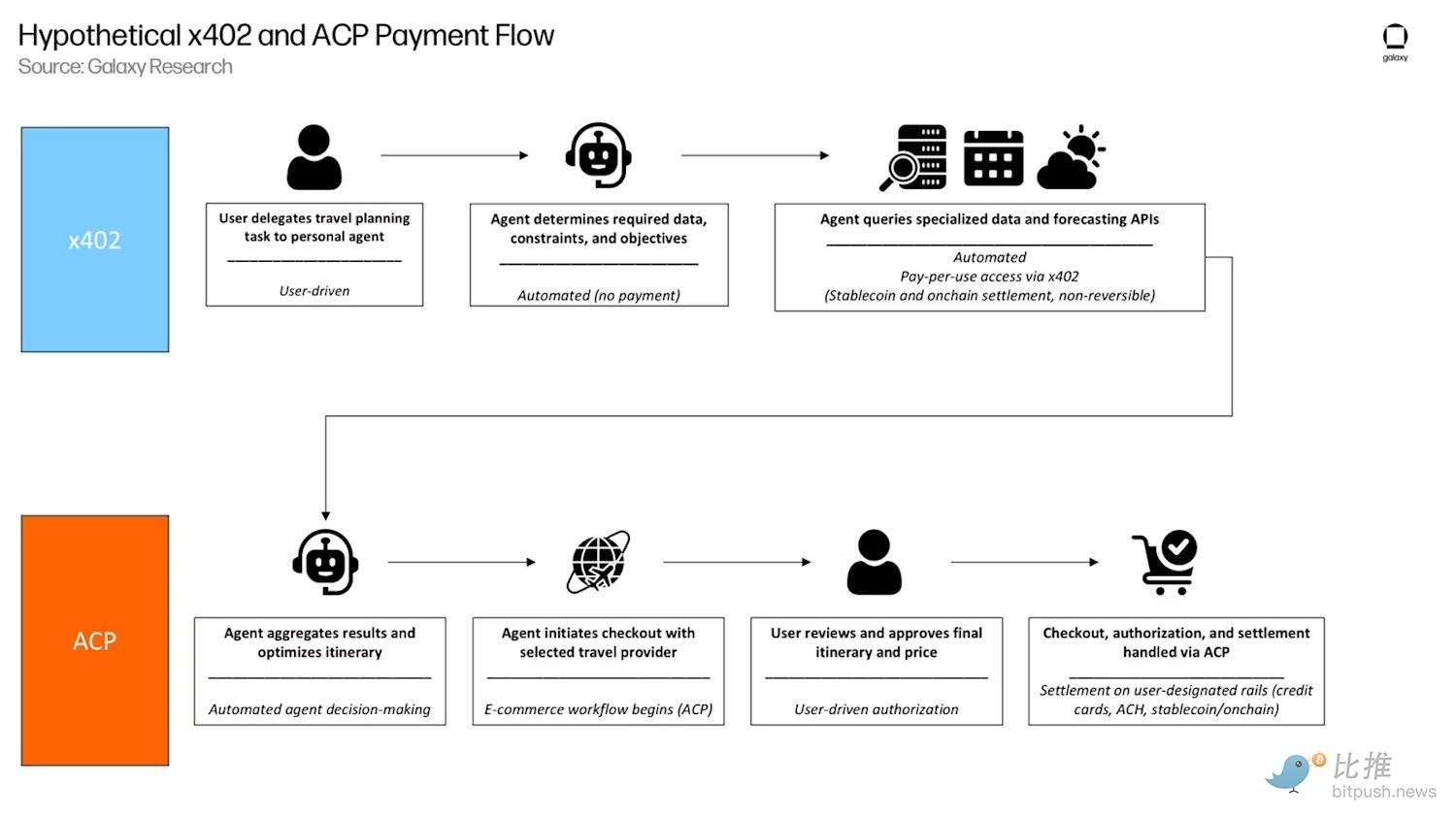 在此工作流中,x402 和 ACP 扮演不同但互补的角色。x402 位于结账流程上游,为传统商业流程之外的资源实现自主支付。