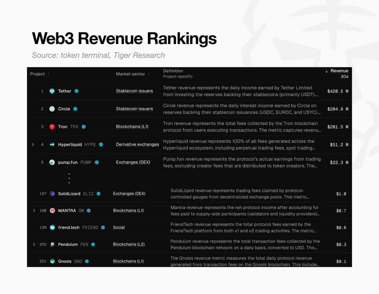 Web3 收入排名表,来源: token terminal 和 Tiger Research