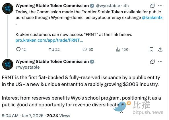 至于刚刚推出的 $FRNT,根据怀俄明稳定代币委员会(WST)的规划,$FRNT 稳定币由 102% 的美债和现金超额抵押。